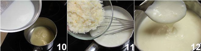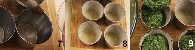 Prepare 4 formas de alumínio com diâmetro de 7 cm e altura de 6 cm: pincele o interior com óleo de sementes 7 e polvilhe com farinha de rosca 8. Esta operação facilitará a retirada final dos bolinhos. Encha as formas com a mistura até a borda 9, coloque-as em uma assadeira e despeje água na assadeira até um terço da sua altura, para que cozinhem em banho-maria no forno. Asse em forno pré-aquecido a 180 graus por cerca de 25/30 minutos; após este tempo, faça o teste do palito que deve sair seco. Desenforme-os com a ajuda de uma faquinha depois de esfriar.
