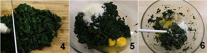 Para preparar os bolinhos de espinafre, lave os espinafres 1 e deixe-os murchar em uma panela em fogo baixo, com um fio de azeite de oliva por cerca de 10 minutos; depois, adicione um pouco de sal 2. Esprema bem os espinafres 3 e