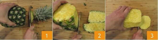 Para preparar os bolinhos de abacaxi, primeiro limpe o abacaxi: remova a coroa superior com a folhagem 1, elimine a casca 2 e corte-o em fatias de 1 cm de espessura 3,