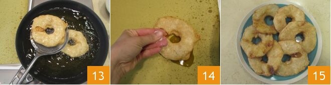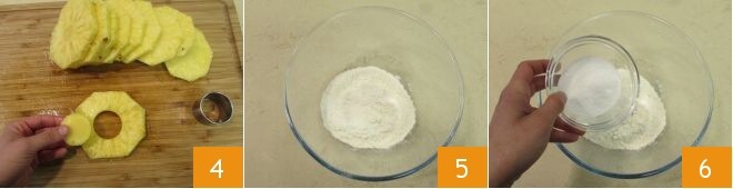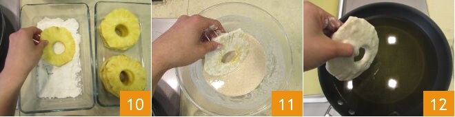 Encha uma panela com bastante óleo de sementes e aqueça até a temperatura de 170° controlando com a ajuda de um termômetro. Passe as fatias de abacaxi cuidadosamente na farinha 10, depois mergulhe-as na massa 11, deixe escorrer o excesso de massa e mergulhe-as delicadamente no óleo quente 12. Frite poucos pedaços de cada vez para evitar que a temperatura do óleo caia.