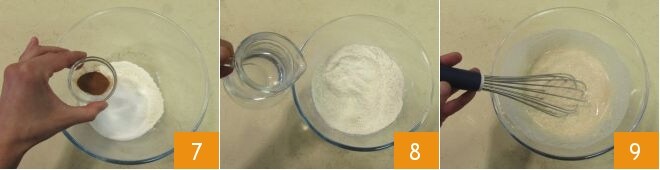 e a canela 7, depois adicione a água 8 e misture com um batedor até obter um composto liso e homogêneo 9.