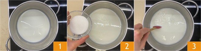 Para preparar as bolinhas de arroz de S e3o Jos e9, primeiro aque e7a o leite em uma panelinha 1. Assim que ferver, acrescente o a e7 facar 2 e mexa para dissolv ea-lo completamente 3.