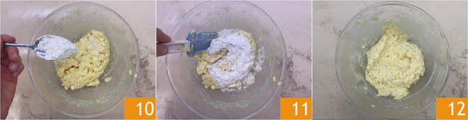 Adicione tamb e9m a farinha 10 e misture tudo com uma esp e1tula de silicone 11 para obter uma massa homog eanea 12.