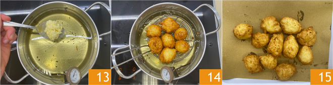 Voc eas est e3o prontos para fritar: aque e7a o f3leo vegetal at e9 a temperatura de 170 b0C, depois coloque colheres da massa com cerca de 25-30 g 13. Frite por aproximadamente 2 minutos at e9 dourarem, virando de vez em quando 14, ent e3o escorra sobre papel-toalha 15. N e3o frite muitas bolinhas de uma vez para evitar que a temperatura do f3leo baixe.