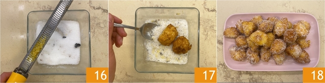 Enquanto isso, aromatize o a e7 facar para polvilhar com as sementes da fava de baunilha e a casca ralada do lim e3o 16. Passe as bolinhas ainda quentes no a e7 facar aromatizado para cobri-las completamente 17. Suas bolinhas de arroz de S e3o Jos e9 est e3o prontas para serem saboreadas 18!