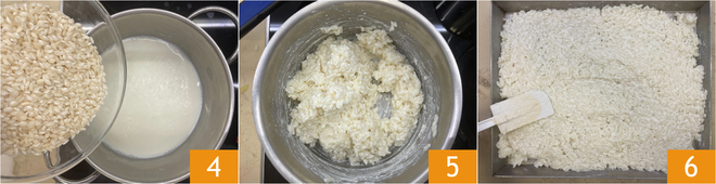 Nesse ponto, junte o arroz 4, mexa e cozinhe em fogo m e9dio-baixo por cerca de 30-45 minutos. Mexa de vez em quando para n e3o deixar grudar. Ao final do cozimento, o arroz dever e1 ter absorvido todo o leite 5. Despeje o arroz cozido em um recipiente baixo e largo e nivele para que esfrie mais r e1pido 6.