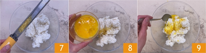 Uma vez frio, transfira o arroz para uma tigela e acrescente as raspas de lim e3o raladas 7, o ovo 8 e o fermento 9. Misture com uma colher.