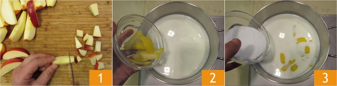 Para preparar os bolinhos de arroz e maçã, primeiro lave e corte as maçãs em cubos de cerca de 2 cm, sem descascá-las 1. Prepare o arroz doce: em uma panela alta coloque o leite, a casca de limão 2 e o açúcar 3.