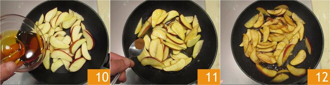 Enquanto isso, prepare as maçãs de acompanhamento: lave e corte as maçãs em fatias de 3-4 mm, ainda sem descascá-las, depois coloque-as em uma frigideira junto com o mel 10 e a canela 11. Cozinhe em fogo baixo por cerca de 15 minutos 12.
