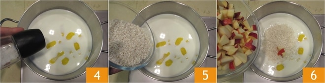 Adicione sal 4 e coloque o arroz 5, depois adicione as maçãs 6.