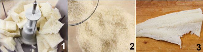 Para preparar os bolinhos de bacalhau, primeiro dessalgue o bacalhau enxaguando bem sob água corrente e colocando-o de molho por dois dias em água fria, trocando a água pelo menos duas vezes ao dia. Enquanto isso, coloque em um processador de alimentos o miolo de pão 1, triture bem e coloque em uma tigela 2. Após dois dias, seque bem o bacalhau 3