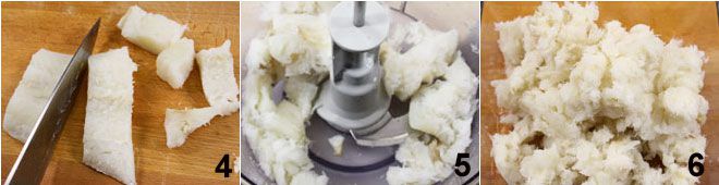 e depois corte em pedacinhos 4. Remova as espinhas dos filés de bacalhau com a ajuda de uma pinça e pique-os finamente com uma faca, ou coloque-os no processador por alguns segundos (5-6).