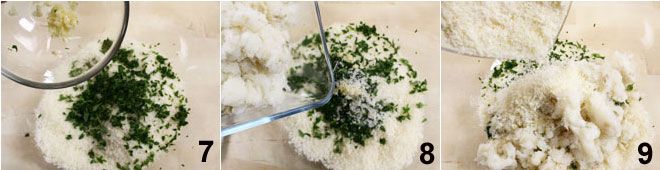 Em uma tigela grande, coloque o miolo triturado, a salsinha, o tomilho, o alho 7, o bacalhau 8 e por último o parmesão ralado 9.