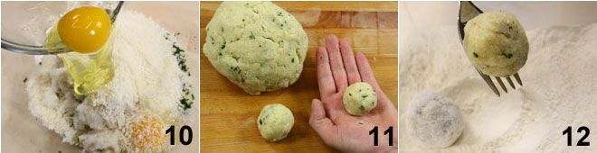 Em seguida, adicione dois ovos 10 e ajuste o sal e a pimenta. Misture bem para integrar tudo de modo a obter uma massa compacta. Com as mãos, forme pequenas bolinhas com a massa 11 e coloque-as em uma bandeja. Prepare três tigelas: uma para a farinha, outra para a farinha de rosca e uma para colocar um ovo batido. Passe as bolinhas primeiro na farinha 12,
