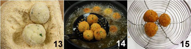 depois no ovo batido e, por último, na farinha de rosca 13. Frite os bolinhos em óleo vegetal bem quente 14. Quando os bolinhos estiverem dourados, escorra-os com a ajuda de uma escumadeira e coloque-os sobre papel absorvente 15 para que percam o excesso de óleo.