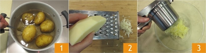Para preparar os bolinhos de batata, primeiro cozinhe as batatas começando com água fria por cerca de 30-40 minutos após a fervura até que estejam macias, verificando com os dentes de um garfo 1. Enquanto isso, rale o caciocavallo com um ralador de furos grandes 2. Quando as batatas estiverem cozidas, descasque-as e amasse-as ainda quentes dentro de uma tigela 3.