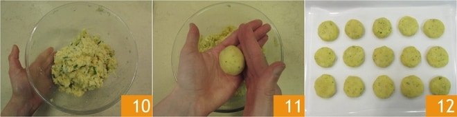Misture com um garfo até obter uma mistura homogênea 10. Agora, pegue pequenas porções de massa de cerca de 25 g cada e forme bolinhas, depois achate-as ligeiramente entre as palmas das mãos 11. À medida que ficarem prontas, coloque os bolinhos em uma bandeja 12.