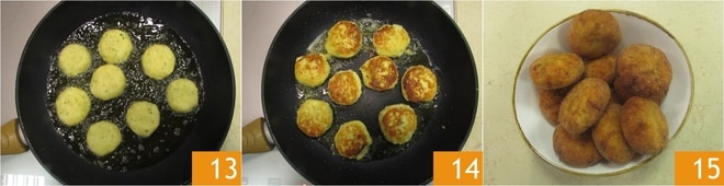Despeje uma camada de óleo em uma frigideira antiaderente e coloque no fogo. Quando o óleo estiver bem quente, adicione os bolinhos e doure-os dos dois lados 13, levará poucos minutos 14. Escorra os bolinhos de batata em papel absorvente e sirva-os ainda quentes 15!