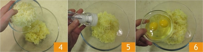 Adicione o caciocavallo 4, o sal 5, a pimenta e os ovos 6.