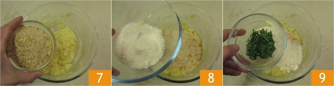 Adicione também a farinha de rosca 7, o Grana ralado 8 e a salsa picada 9.
