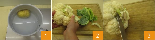 Para preparar os bolinhos de couve-flor, comece pela batata: lave-a e depois cozinhe-a por cerca de 30-40 minutos, dependendo do tamanho (você pode encurtar o tempo usando uma panela de pressão). Enquanto isso, limpe a couve-flor: remova as folhas externas 1, a parte do caule 2 e separe as florezinhas com as mãos.