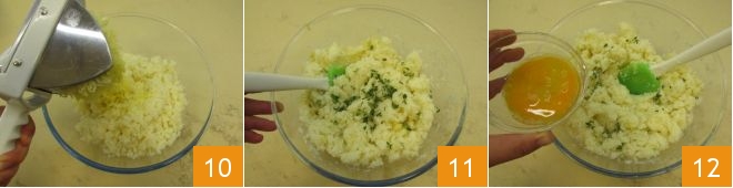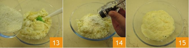Em seguida, adicione o Grana Padano ralado 13, o sal e a pimenta 14 e misture para uniformizar a massa 15.