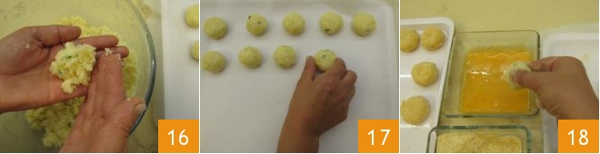 Neste ponto, pegue cerca de 25 g de massa e forme os seus bolinhos de couve-flor 16; à medida que os forma, coloque-os em uma bandeja forrada com papel manteiga 17. Você obterá cerca de 35. Agora, empane os bolinhos passando-os primeiro no ovo 18