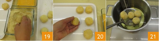 e depois na farinha de rosca 19, colocando-os aos poucos em outra bandeja 20. Aqueça o óleo de amendoim em uma panela funda até atingir a temperatura de 170° (medida com um termômetro de cozinha) e comece a fritar poucos bolinhos de cada vez 21,