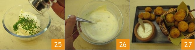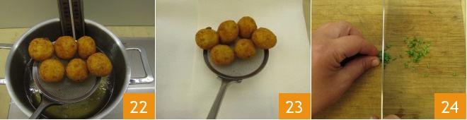 até que fiquem bem dourados; levará apenas alguns minutos. Uma vez cozidos, escorra-os do óleo usando uma escumadeira 22 e transfira-os para um prato forrado com papel toalha 23. Continue com a fritura dos outros bolinhos. Em seguida, prepare também o molho de acompanhamento: pique finamente a cebolinha 24