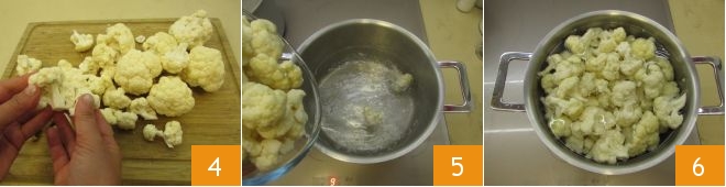 Em seguida, separe-as ainda mais com as mãos 4. Coloque no fogo uma panela cheia de água e, quando começar a ferver, coloque a couve-flor 5 e cozinhe por cerca de dez minutos 6.