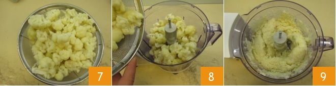 Após 10 minutos, escorra bem a couve-flor e deixe esfriar um pouco 7. Neste ponto, transfira-a para o recipiente de um mixer equipado com lâminas 8 e acione as lâminas até reduzir a couve-flor a um creme 9. Então, transfira para uma tigela grande.