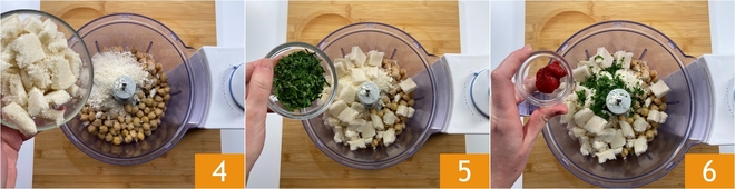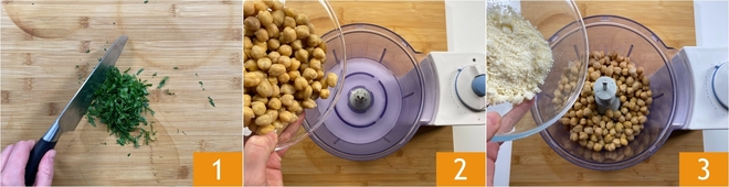 Para preparar os bolinhos de grão-de-bico, a primeira coisa é picar a salsinha 1 e deixá-la de lado. Na tigela do processador de alimentos, coloque os grãos-de-bico previamente enxaguados e escorridos 2. Adicione o Grana ralado 3.