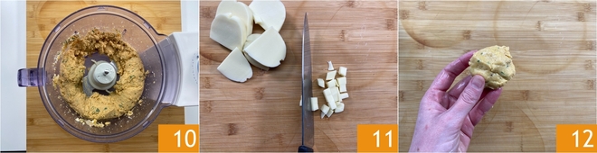 Triture tudo até obter uma mistura lisa e maleável, um pouco como um hummus bem espesso 10. Corte o provolone em pedaços bem pequenos 11. Agora forme os bolinhos: retire 35 g da massa com as mãos untadas ou umedecidas 12 e achate levemente na palma da mão.