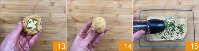 Insira alguns pedaços de provolone no meio 13 e feche de forma que obtenha um bolinho redondo, que envolva o queijo por dentro 14. Agora, em uma travessa, coloque a farinha de rosca, adicione mais salsinha picada e uma pitada de pimenta 15. Misture.