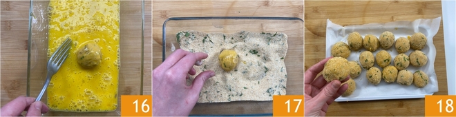 Cuide da cobertura. Passe cada bolinho no ovo, batido com uma pitada de sal 16 e depois na farinha de rosca recém-preparada 17. À medida que os bolinhos ficam prontos, coloque-os em uma bandeja 18.