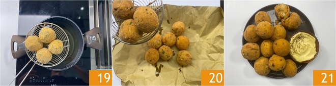 No momento de fritar, aqueça o óleo a 160-170°C. Assim que atingir a temperatura certa, mergulhe alguns pedaços por vez 19. Cozinhe até ficarem bem dourados e escorra em papel absorvente 20. Salgue levemente e sirva seus bolinhos de grão-de-bico com o molho de sua preferência 21.