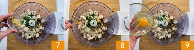 Coloque também a mostarda 7, o alho seco 8, a pimenta, o sal e o ovo 9.