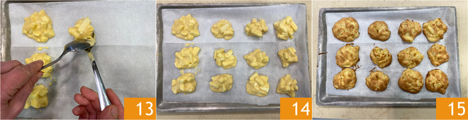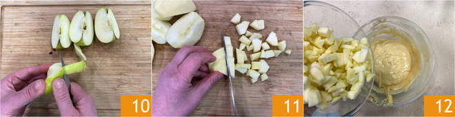 Prepare as maçãs: descasque-as 10 e corte-as primeiro em fatias finas e depois em cubos de 1 cm 11; você precisará de cerca de 300 g de polpa. Adicione as maçãs à massa 12 e incorpore com uma colher 12.