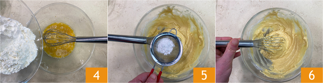 Adicione a farinha peneirada 4 e o fermento peneirado 5 e misture delicadamente com o batedor para não formar grumos 6.