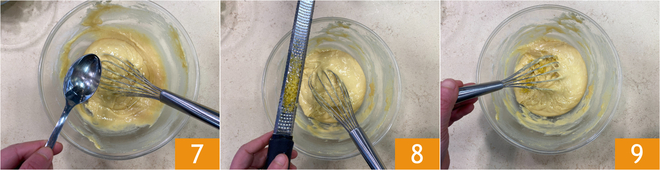 Nesse ponto, adicione o óleo 7 e aromatize com a casca ralada de limão 8. Dê uma última misturada e reserve 9.