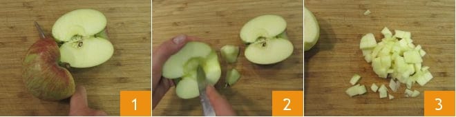 Para preparar os bolinhos de maçã e ricota, primeiro corte as maçãs ao meio 1, retire o caroço central 2 e descasque-as. Em seguida, corte-as em cubinhos de cerca de 1 cm 3.