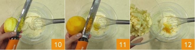 Misture para incorporar esses ingredientes e depois aromatize a massa com a casca ralada de limão 10 e de laranja 11. Adicione os cubinhos de maçã 12