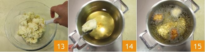 E misture para distribuí-los dentro da massa. A mistura está pronta para cozinhar 13. Coloque no fogo uma panela de borda alta e despeje o óleo de sementes dentro. Aqueça o óleo e quando atingir 160°, mergulhe uma colher de massa 14. Cozinhe poucos bolinhos de cada vez por cerca de 8 minutos 15 e quando ficarem dourados,
