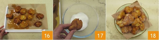 escorra-os em uma bandeja forrada com papel absorvente 16 e deixe-os esfriar. Para finalizar, passe-os no açúcar 17 e sirva bem quentes os bolinhos de maçã e ricota 18.