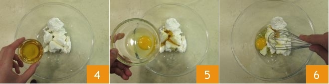 Despeje em uma tigela a ricota bem escorrida do seu soro, o mel 4, o ovo inteiro 5 e misture com um batedor 6.