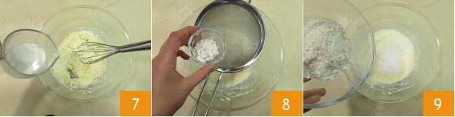 Adicione agora o leite 7, o fermento peneirado 8 e a farinha 9.
