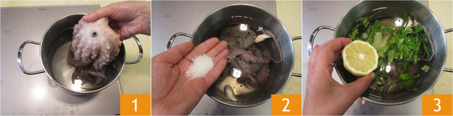 Para os bolinhos de polvo, comece cozinhando o polvo (já limpo): coloque-o em uma panela grande, imerso em água fria 1, adicione também uma pitada de sal grosso 2, pimenta preta em grãos, dentes de alho esmagados, parte do maço de salsa, a casca do limão e metade dele 3. Conte 2 horas a partir do momento em que a água começar a ferver.