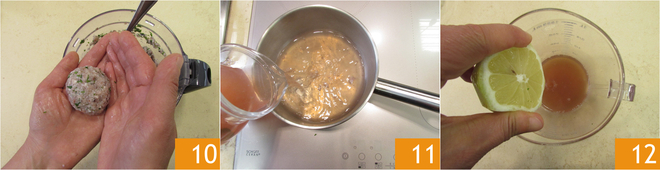 Dessa massa, você pode formar os bolinhos, renderão cerca de 10-12, dependendo do tamanho 10. Deixe-os firmar na geladeira por cerca de 15 minutos. Enquanto isso, dedique-se à maionese: coe a água de cozimento do polvo, você precisará de 500 ml. Coloque-a em uma panela pequena 11 e reduza em fogo baixo até que restem 100 ml de líquido, depois deixe esfriar. Transfira o concentrado de água de polvo para um recipiente alto e esprema o suco do limão, você precisará de cerca de 1 colher de sopa 12.