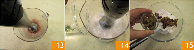 Ligue o mixer de imersão 13 e adicione lentamente o óleo de sementes enquanto continua a bater 14. A maionese que você obterá será lisa e aveludada. Adicione as azeitonas e as alcaparras previamente escorridas e picadas 15 e misture.
