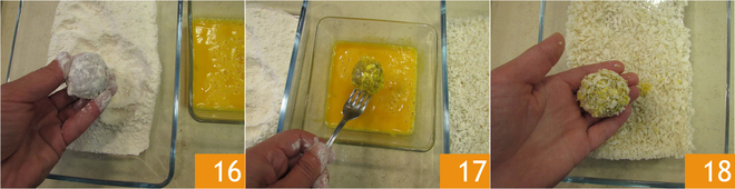 Retire os bolinhos da geladeira e aqueça o óleo de sementes até uma temperatura de 175°C. Passe em seguida os bolinhos: primeiro na farinha 16, depois nos ovos batidos 17 e, finalmente, no panko 18.